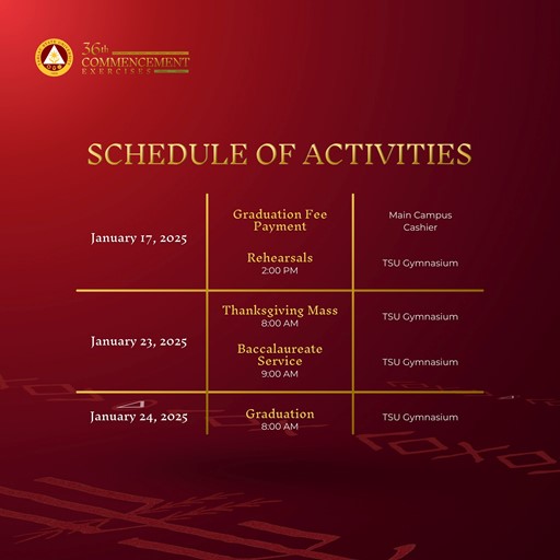 The activities and schedule for the 36th Commencement Exercises of Tarlac State University this January 24, 2025 is now available through TSU Memorandum Order No. 74, s. 2024.