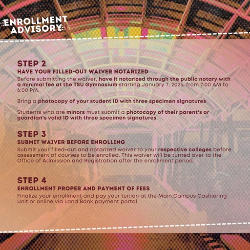 You must also bring a photocopy of your TSU student ID with three specimen signatures. Meanwhile, students who are minors must submit a photocopy of their parent's or guardian's valid ID with three specimen signatures.