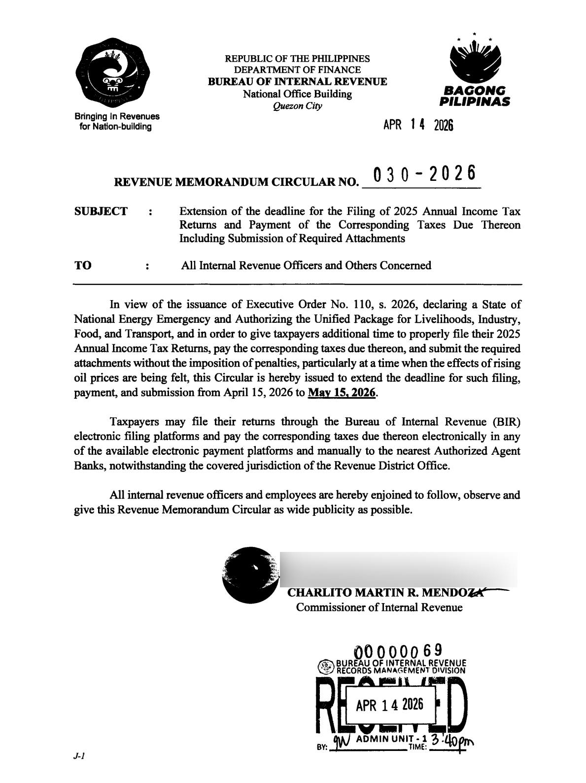 The Bureau of Internal Revenue (BIR) has issued Revenue Memorandum Circular No. 30-2026, extending the deadline to May 15, 2026 for the filing of 2025 Annual Income Tax Returns, payment of the corresponding taxes due thereon, and submission of required attachments.